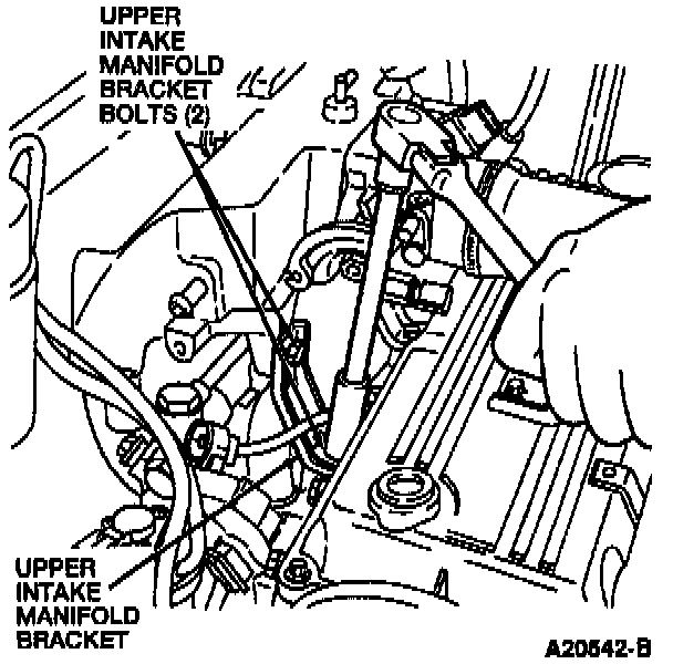 3. Remove the two upper intake manifold bracket bolts and the upper intake manifold bracket.