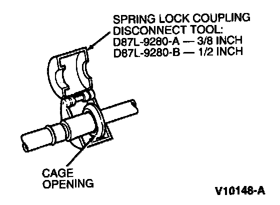 4. Fit Spring Lock Coupling Tool D87L-9280-A (3/8 inch) or D87L-9280-B (1/2 inch) or equivalent to the coupling.
