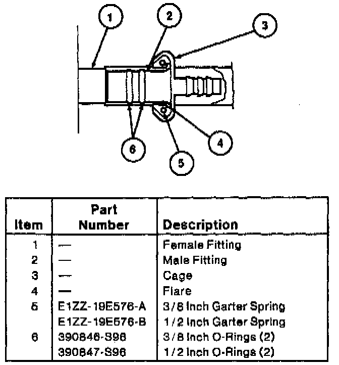1. Be sure the garter spring is in the cage of the male fitting. If the garter spring is missing, install a new spring by pushing it into the cage opening. If the garter spring is damaged, remove it from the cage with a small wire hook (do not use a screwdriver) and install a new spring.