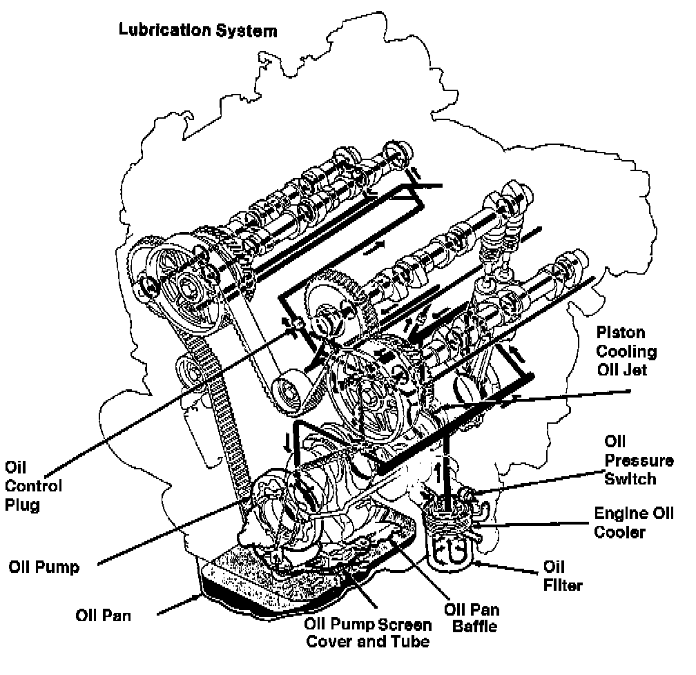 The engine lubrication system is a full-flow, force-fed type system, pressurized by an oil pump. The oil is supplied under full pressure through various channels. Oil is pulled up from the oil pan through the oil pump screen cover and tube to the oil pump From the oil pump, the oil is sent through the oil filter, then to the cylinder block, crankshaft, and the camshaft bearing journals. Oil also flows through the piston cooling oil jets and is sprayed onto the underside of the piston to cool the piston. Oil is also circulated through the oil control plugs, cooling and lubricating the upper cylinder heads, camshafts, and hydraulic lash adjusters.