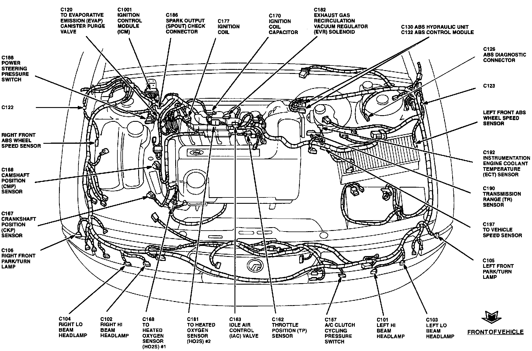 The Ignition Control Module is located at the RH rear of the engine compartment, on strut tower bracket.