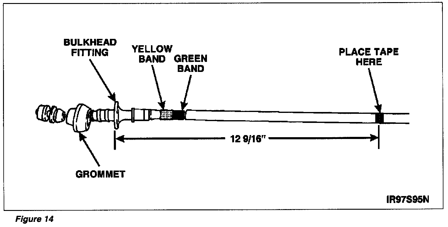 14. On new accelerator cable, measure 12-9/16 inches down from bulkhead fitting and mark cable with a piece of tape. See Figure 14. Make sure the green and yellow bands are flush to the bulkhead fitting before measuring.
