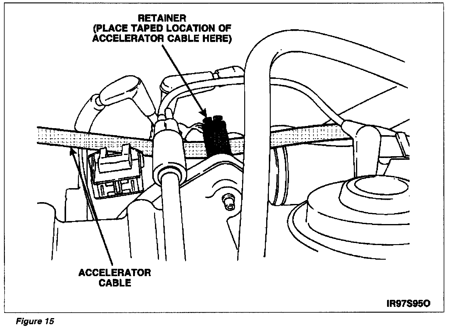 18. Attach retainer W700637-S300 to top stud of Idle Air Control (IAC) valve. Secure accelerator cable in the retainer at point marked by the tape. Refer to Figure 15. Accelerator cable should be close to, but not touching, brake booster.