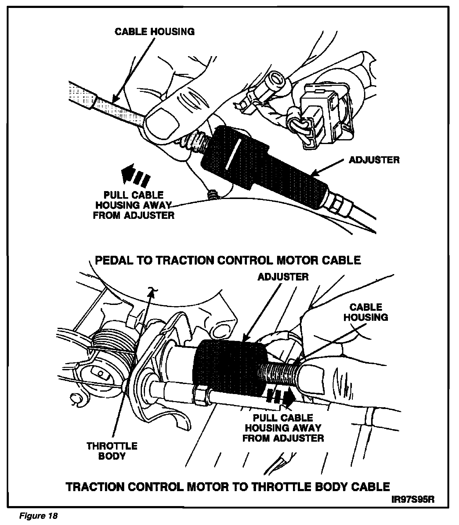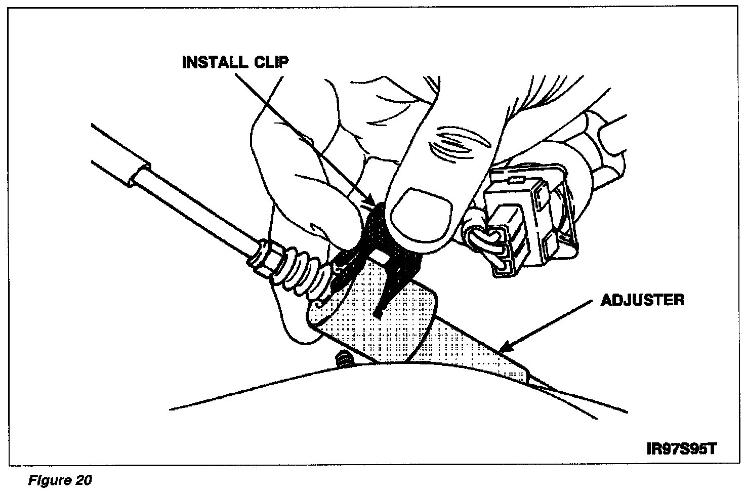 ^ Install clip into adjuster on the accelerator pedal to traction control motor cable. See Figure 20.