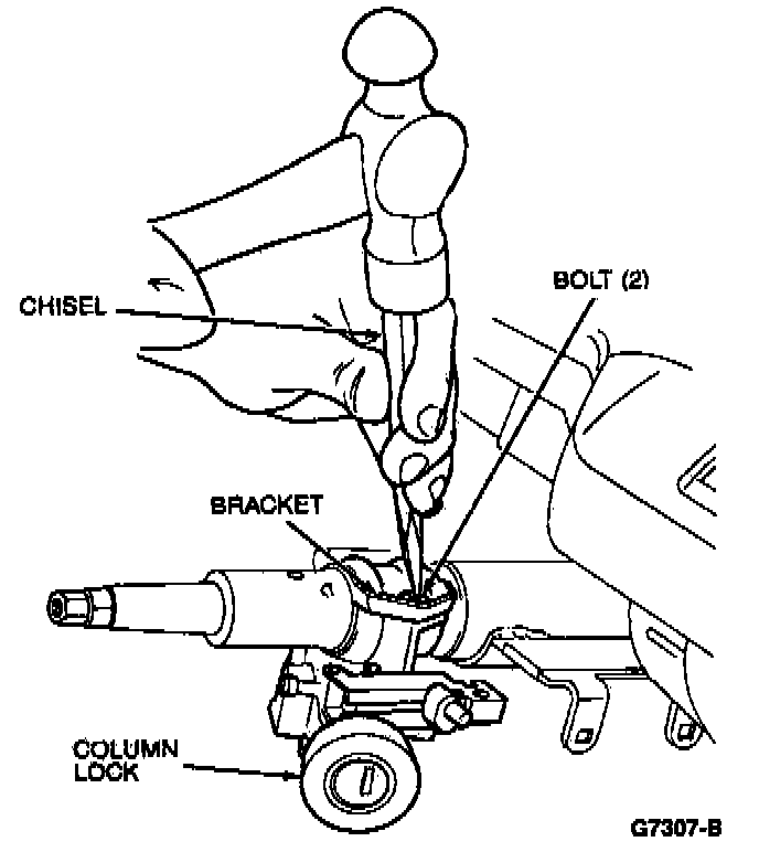 6. Using a hammer and chisel, make a groove in the head of each of the two column lock mounting bracket bolts.