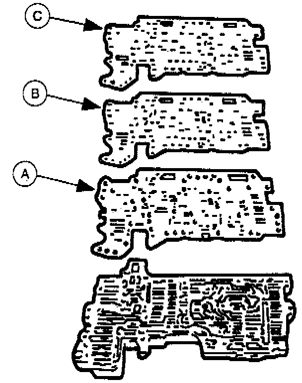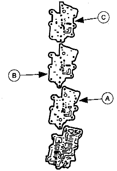 13. Install a new (A) upper gasket, (B) upper separator plate, and a new (C) main upper gasket onto the upper control valve body.