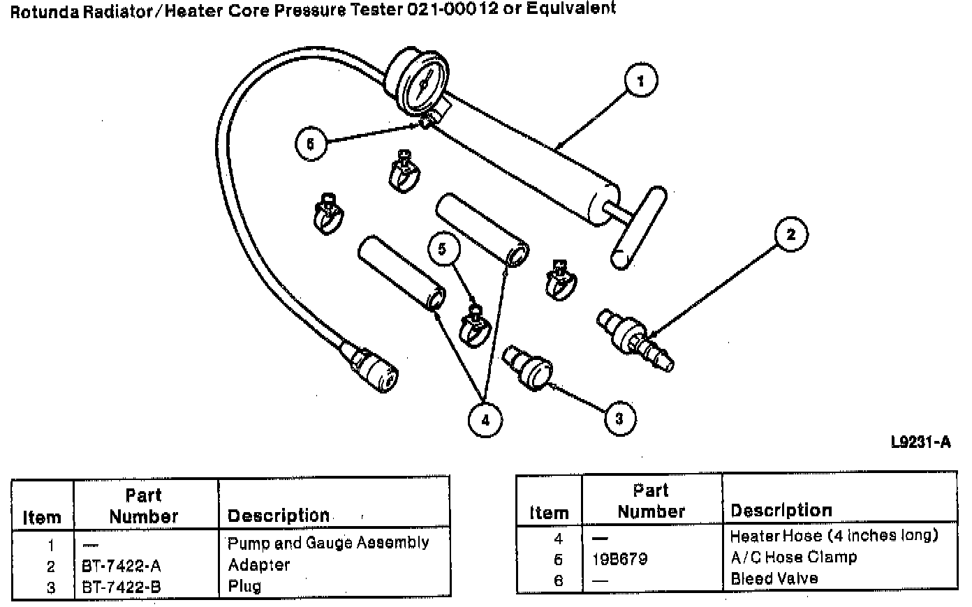 a. Attach the Rotunda Radiator/Heater Core Pressure Tester 021-00012 or equivalent to Adapter BT-742 2-A on the heater water hose.