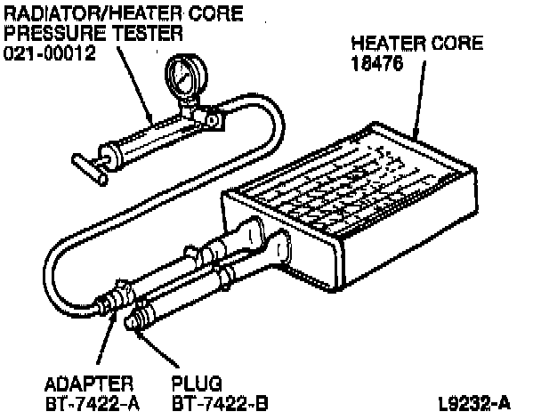 8. If the pressure drops, check the heater water hose connections to the heater core tubes for leaks. If the heater water hoses do not leak, remove the heater core from the vehicle and perform the bench pressure test.