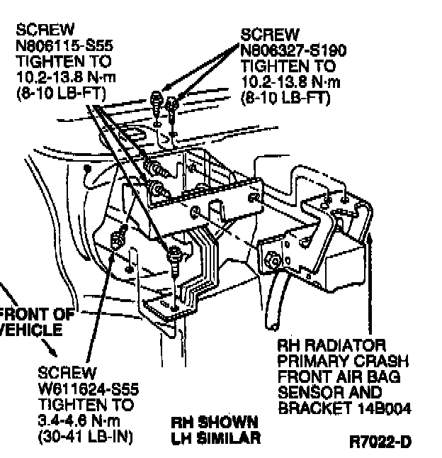 1. Position RH radiator primary crash front air bag sensor and bracket and LH radiator primary crash front air bag sensor and bracket and wire lead in vehicle and secure sensor to RH and LH radiator support with four retaining screws. Tighten to 10.2-13.8 N.m (8-10 lb-ft).