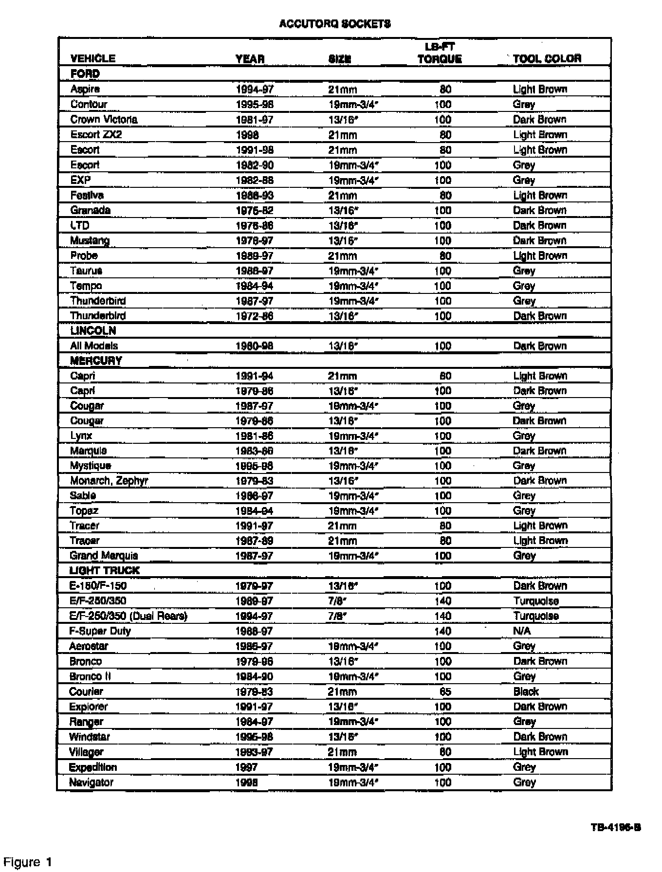 REFER TO THE APPROPRIATE SERVICE MANUAL OR THE CHART IN FIGURE 1 FOR THE CORRECT WHEEL LUG NUT TORQUE SPECIFICATION. THE CHART IN FIGURE 1 ALSO PROVIDES THE CORRECT "ACCUTORO" LUG NUT SOCKET TO USE.
