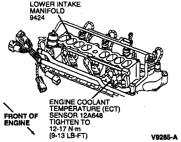 4. Remove engine coolant temperature sensor from heater tube located on lower intake manifold (9424).