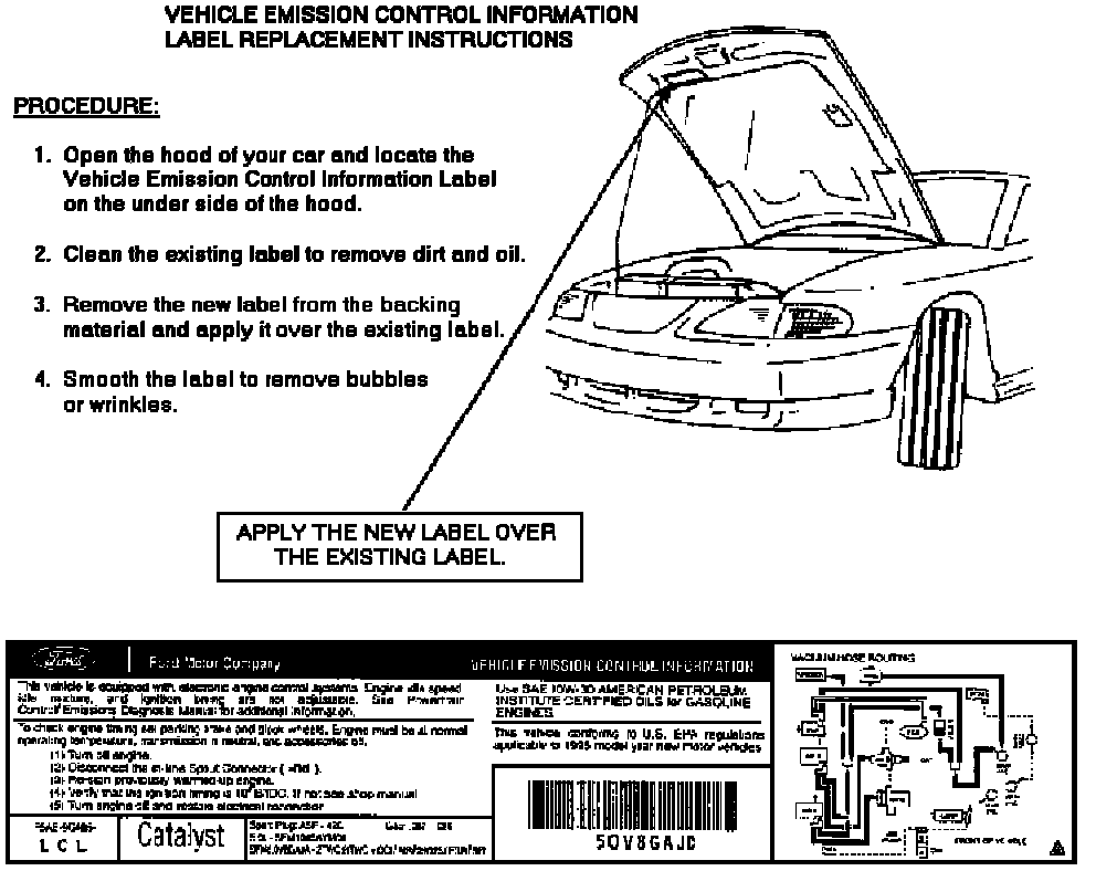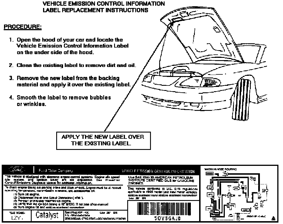 The Environmental Protection Agency and the California Department of Motor Vehicles require that a correct Vehicle Emissions Control Information Label be attached to your Mustang for registration/servicing purposes. For your convenience, a new label is enclosed with instructions for attachment to your car. If you prefer, you may return to a Ford or Lincoln-Mercury Dealer for this service.