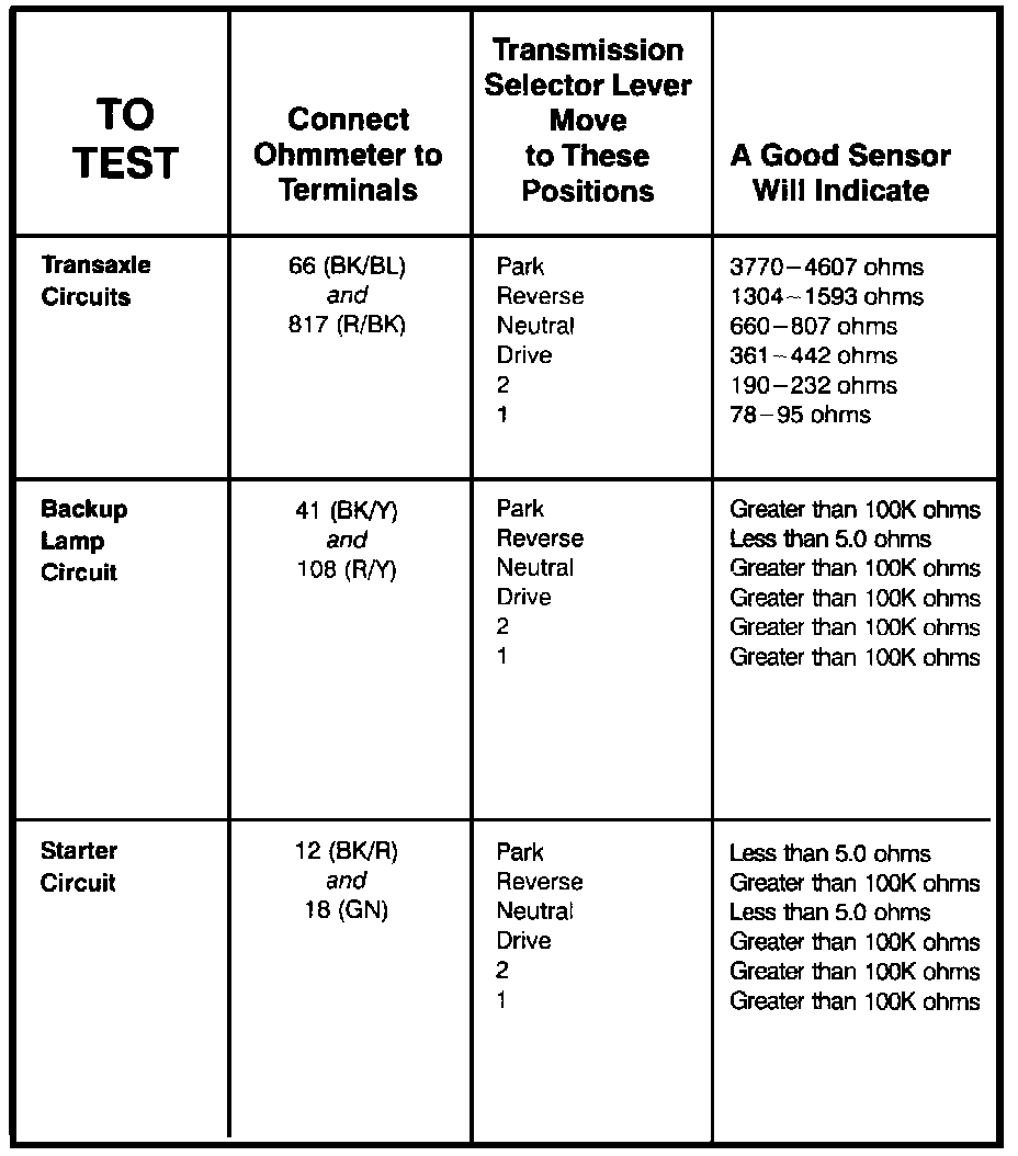 Transmission Range Sensor - Component Testing Procedure: