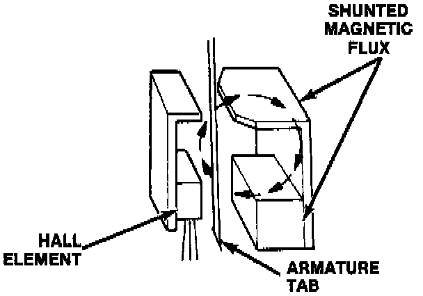 When a tab is in the magnetic path, the field strength decreases (shunted through the tab), and there is no output from the element.