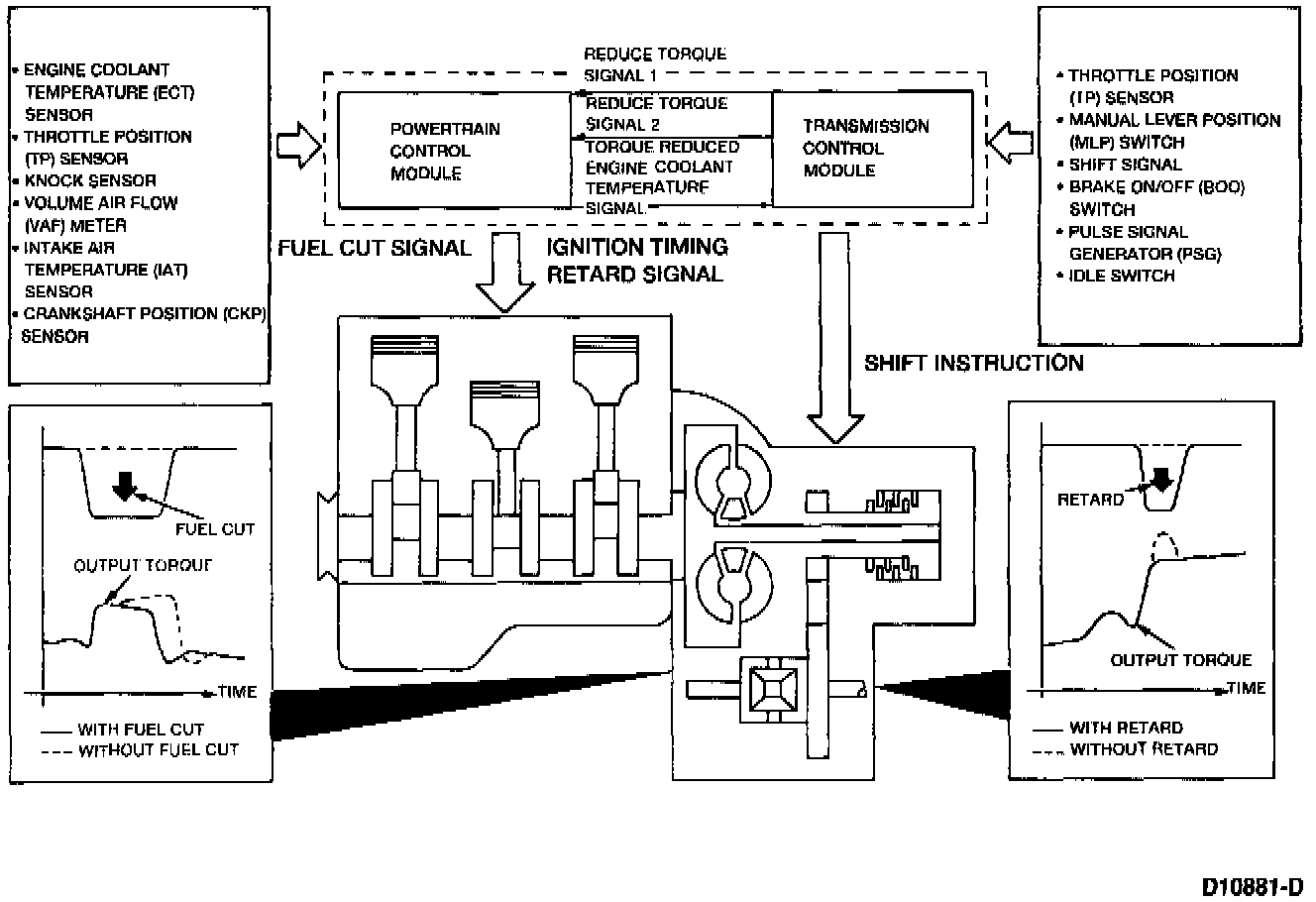 In order to minimize shift shock, a torque reduction control system is used. This system temporarily reduces engine torque to improve shift quality by cutting off fuel delivery during upshifts and retarding ignition timing during downshifts. If torque reduction is not possible, the Transmission Control Module (TCM) adjusts line pressure to a pre-programmed amount to reduce shift shock. The TCM sends two reduce torque signals (Reduce Torque Signal 1 for upshifts, Reduce Torque Signal 2 for downshifts) to the Powertrain Control Module (PCM). The PCM sends a Torque Reduced/Engine Coolant Temperature signal to the TCM which notifies the transaxle of torque reduction.