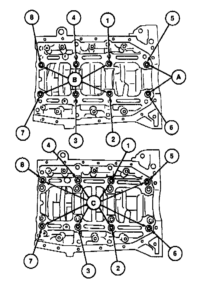 Note: Lower cylinder block bolts (A) are marked with a 4 on the head. Lower cylinder block bolts (B) are marked with a 1 on the head. Crankshaft main bearing cap studs (C) are not marked.1. Tighten lower cylinder block bolts "A" and "B" in two or three steps in the order shown to 23-25 N.m (17-19 lb ft). Tighten lower cylinder block bolts "C" in two or three steps in the order shown to 18-21 N.m (13-15 lb ft).