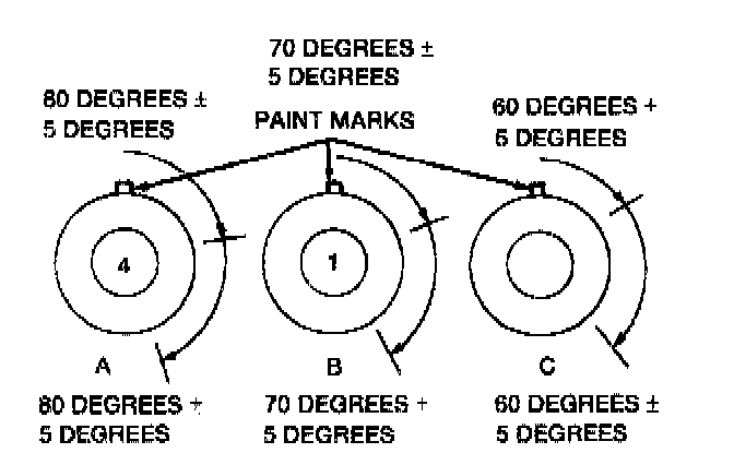 5. Using the marks as a reference, tighten the lower cylinder block bolts "C" by turning them 60° ±5°.