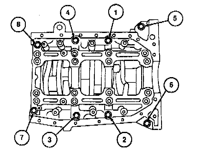 7. Tighten the lower cylinder block bolts in the order shown to 19-21 Nm(14-15 lb ft).