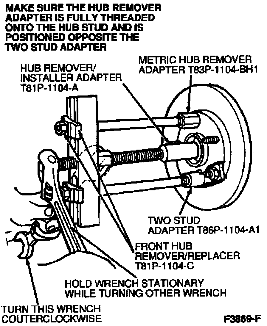11. Install Hub Remover/Installer Adapter T81P-1104-A with Front Hub Remover/Replacer T81P-1104-C and Wheel Bolt Adapters T83P-1104-BH1 and Two Stud Adapter T86P-1104-A1 or equivalent and remove hub, bearing and knuckle assembly by pushing out CV joint outer shaft until it is free of assembly.