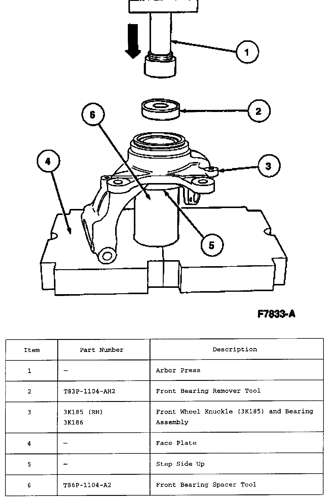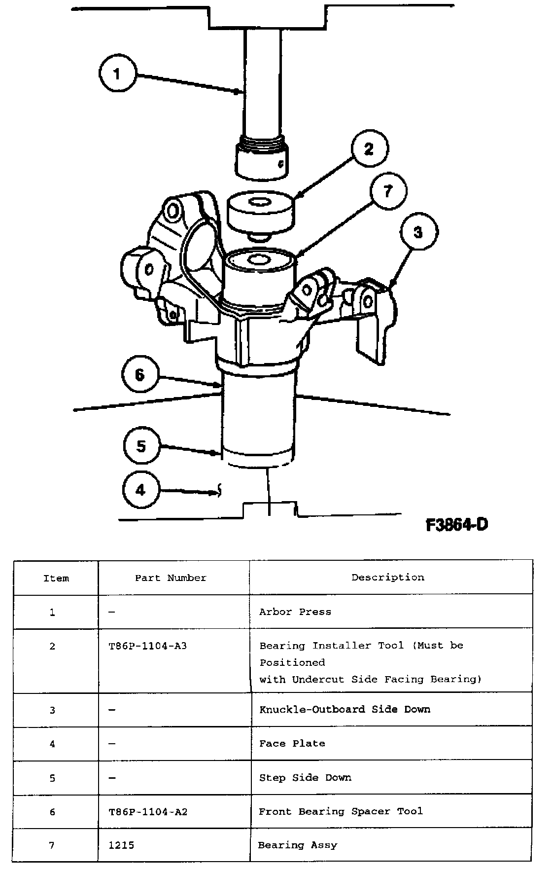 2. Place Front Bearing Spacer T86P-1104-A2 or equivalent step side down on hydraulic press plate and position knuckle (outboard side down) on spacer. Position a new bearing in inboard side of knuckle. Install Bearing Installer T86P-1104-A3 or equivalent (undercut side facing bearing), on bearing outer race and press bearing into knuckle. Ensure that bearing seats completely against shoulder of knuckle bore.