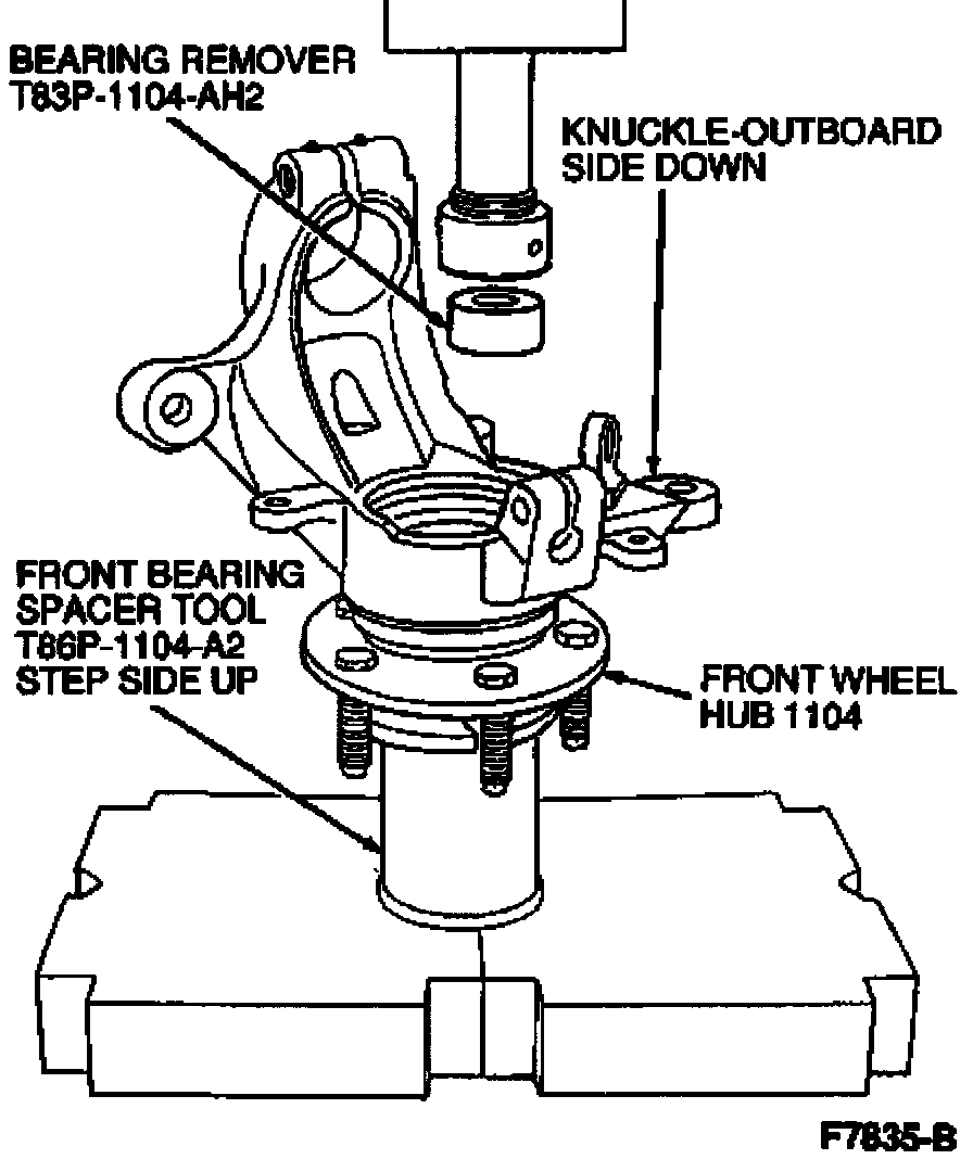 4. Place Front Bearing Spacer T86P-1104-A2 or equivalent on the arbor press plate and position hub on tool with lugs facing downward. Position knuckle assembly (outboard side down) on the hub barrel. Place Bearing Remover T83P-1104-AH2 or equivalent flat side down, centered on inner race of the bearing and press down on tool until bearing is fully seated onto hub. Ensure that hub rotates freely in knuckle after installation.