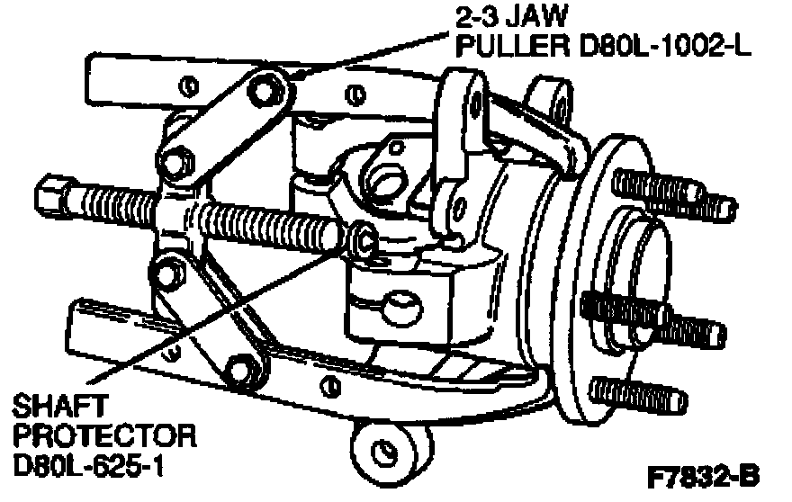 14. On the bench, install 2-3 Jaw Puller D80L-1002-L and Shaft Protector D80L-625-1 or equivalent, with jaws of puller on front wheel knuckle bosses and remove wheel hub from front wheel knuckle.