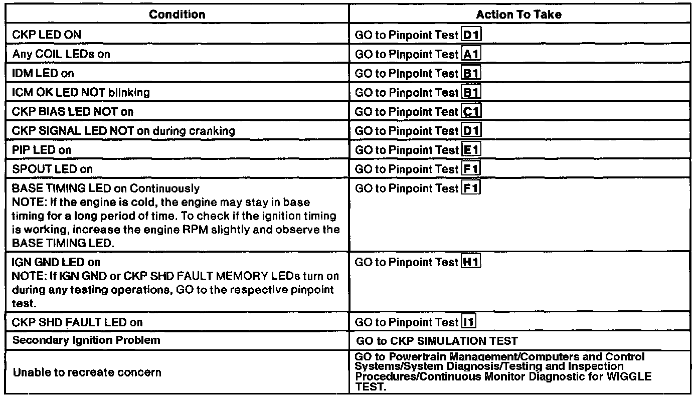 NOTE: During EEC Self-Test, were any codes recorded? If YES, See Powertrain Management/Computers and Control Systems/System Diagnosis/Testing and Inspection Procedures/Diagnostic Trouble Code Charts and Descriptions for code definition. Testing and Inspection If there were Ignition Diagnostic Monitor (IDM) codes, GO to the appropriate IDM pinpoint test. Pinpoint Test Diagnostics