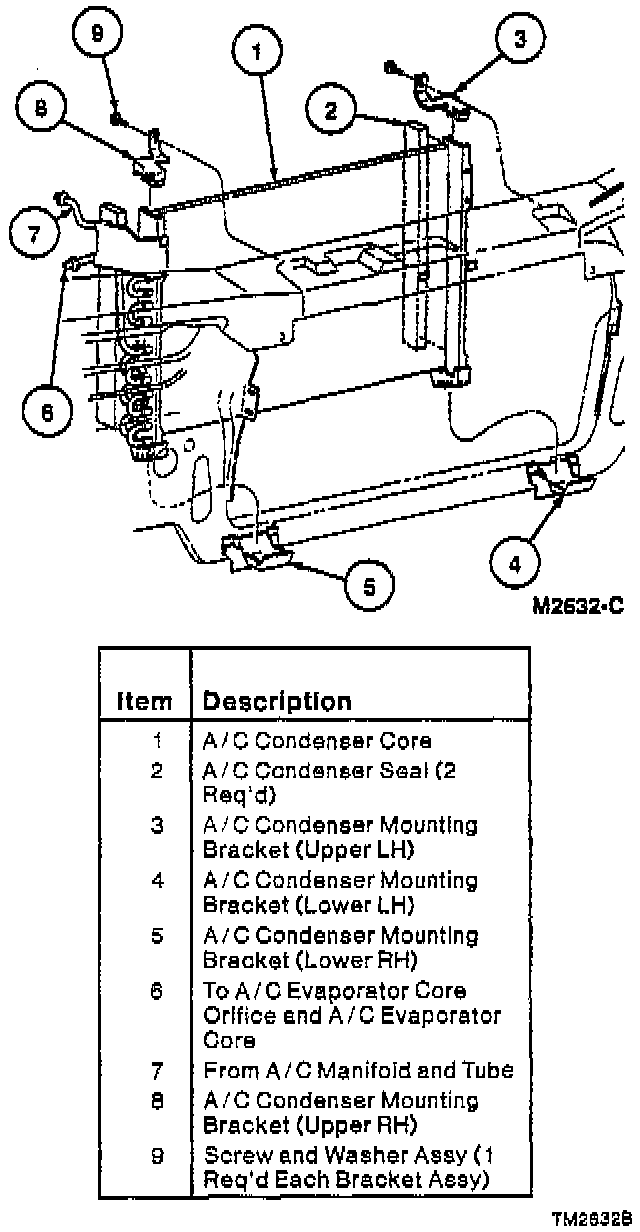 NOTE: Whenever a condenser is replaced, it us also necessary to replace the suction accumulator/drier.CAUTION: If a condenser leak is suspected, the condenser must be leak tested before it is removed from the vehicle.