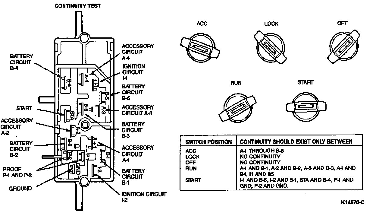 Disconnect the multiple connector from the ignition switch. Test the ignition switch continuity as described in the following illustration. Connect a self-powered test lamp or ohmmeter between the blade terminals indicated on the chart in the illustration. No continuity between any blade and the ground terminal should exist in any ignition switch position except the proof and ground pins (P-1, P-2 and GND) in the START position only.