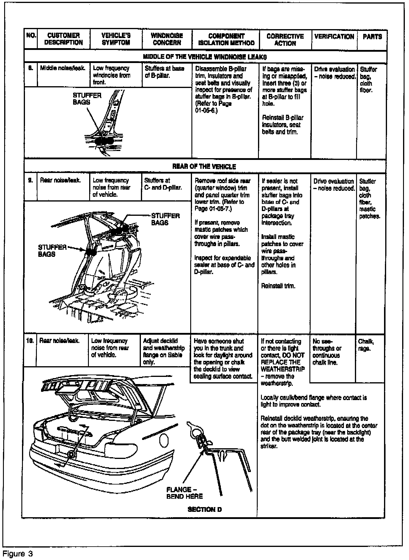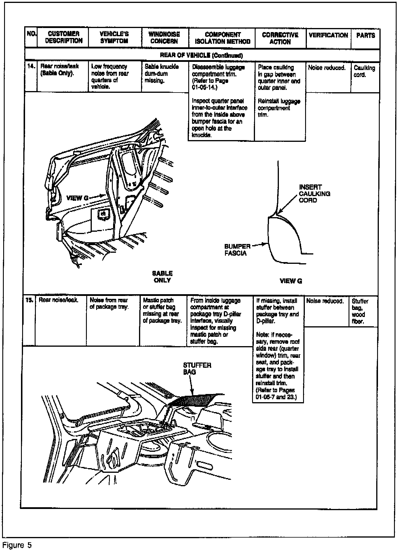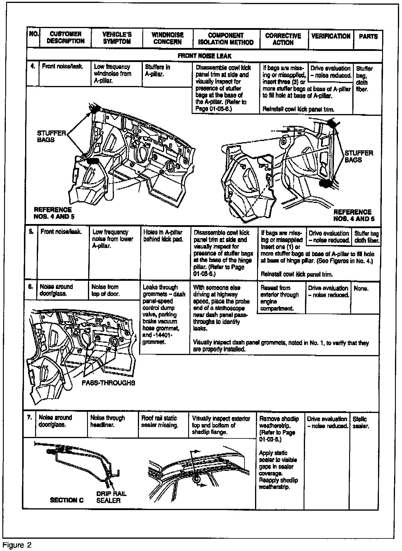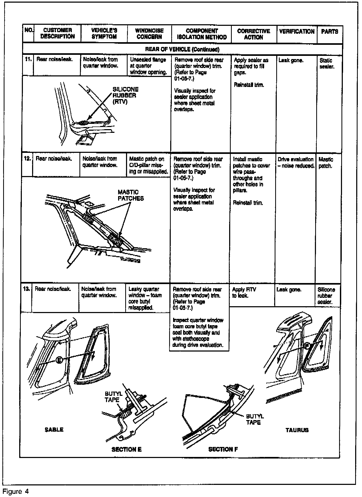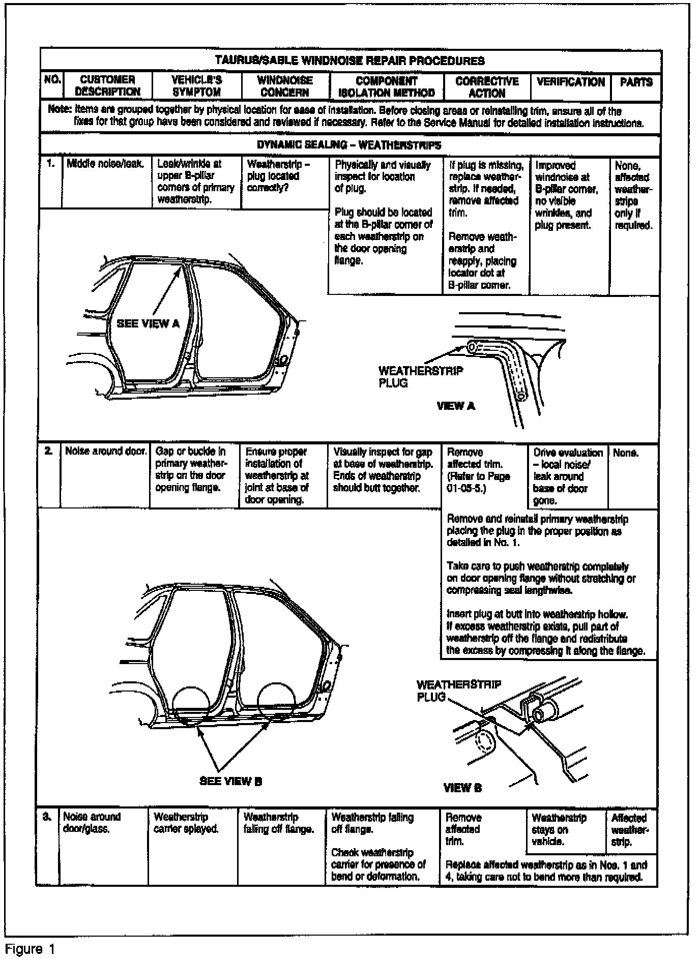 Use the repair chart to diagnose and repair customer concerns of windnoise on all models. Refer to Figures 1-5 in this TSB article and to the appropriate Taurus/Sable Service Manual for service details.