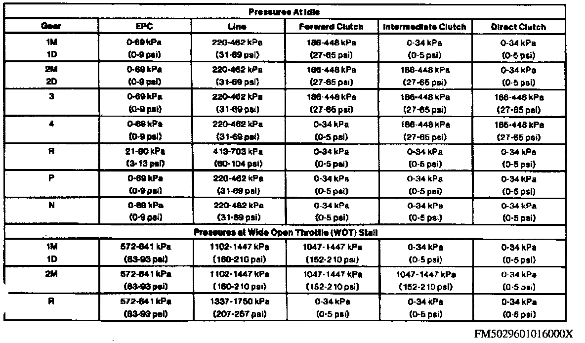 LINE PRESSURE TESTCAUTION: Perform the line pressure test prior to the stall speed test. If line pressure is low at stall, do not perform stall speed test, as transmission damage will occur. Do not allow engine to run at Wide Open Throttle (WOT) for more than 5 seconds.