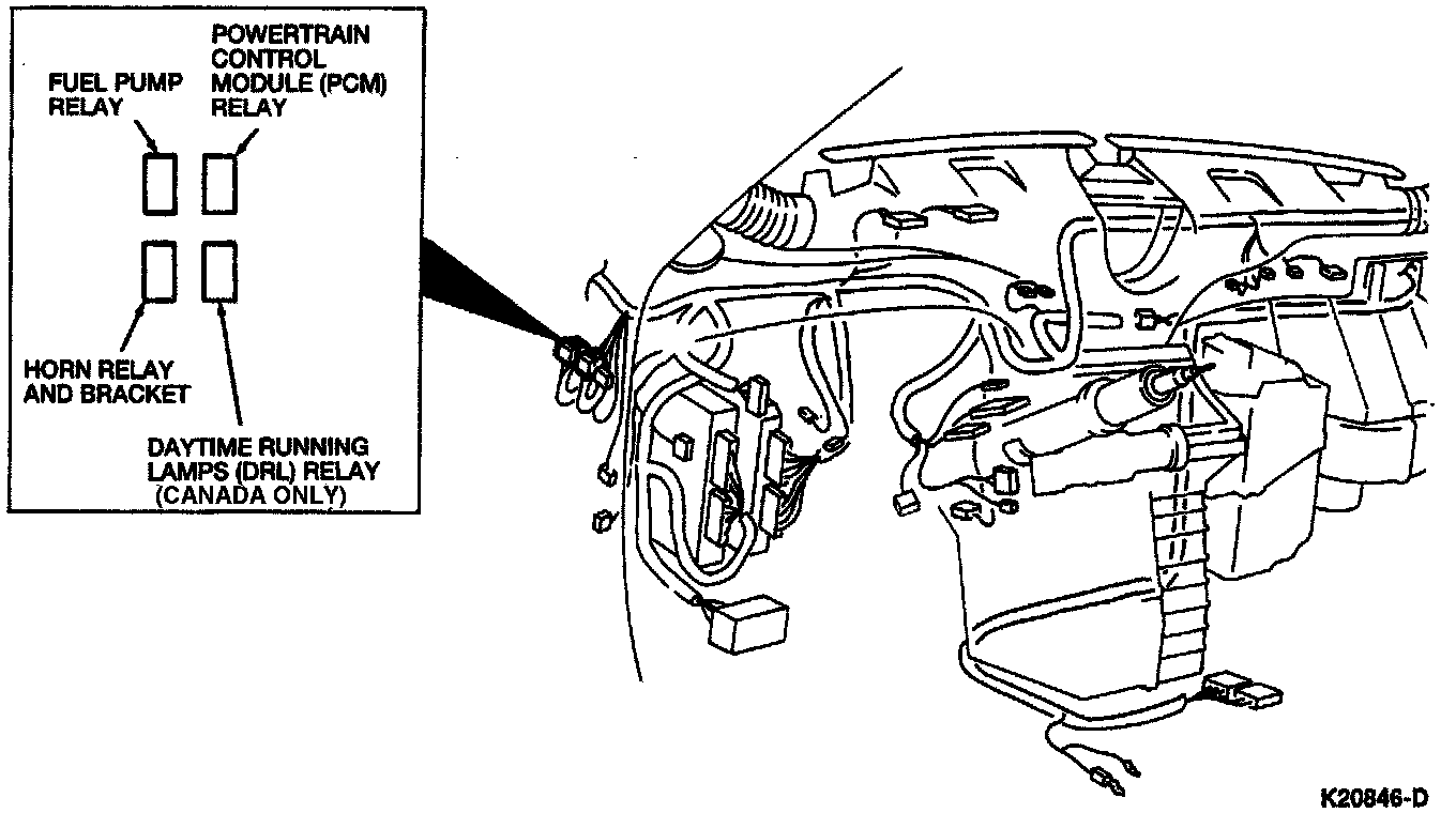 The main relay for the powertrain control module is located under the left side of the instrument panel.