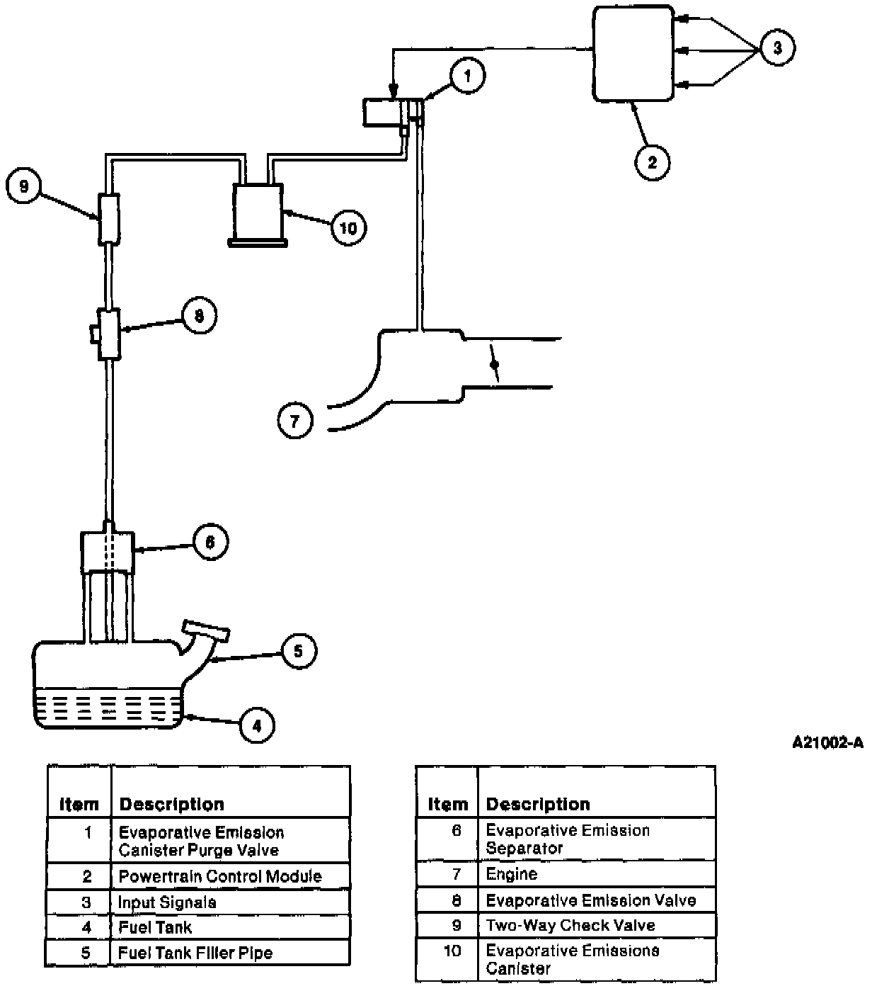Fill control is accomplished through a vent line attached to the fuel tank filler pipe extending inside the fuel tank. The evaporative emission valve, mounted in the top panel of the fuel tank, and the attached vapor line leading to the Evaporative Emissions (EVAP) canister, also contribute to fill control. These components control the pressure in the fuel tank when the fuel level rises and covers the fill vent opening in the fuel tank.