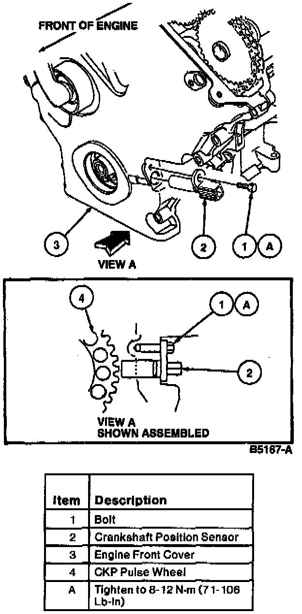 2. Position crankshaft position sensor and install retaining bolt. Tighten to 8-12 Nm (71-106 lb in).