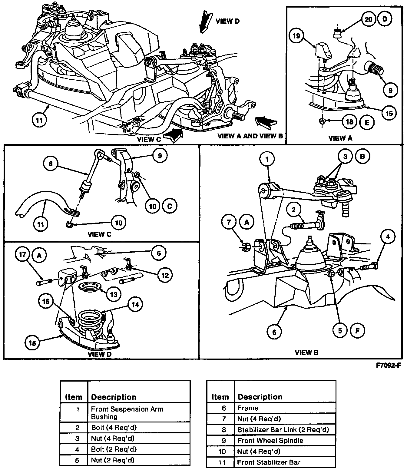 1. Position front suspension lower arm in frame brackets and loosely assemble fasteners.