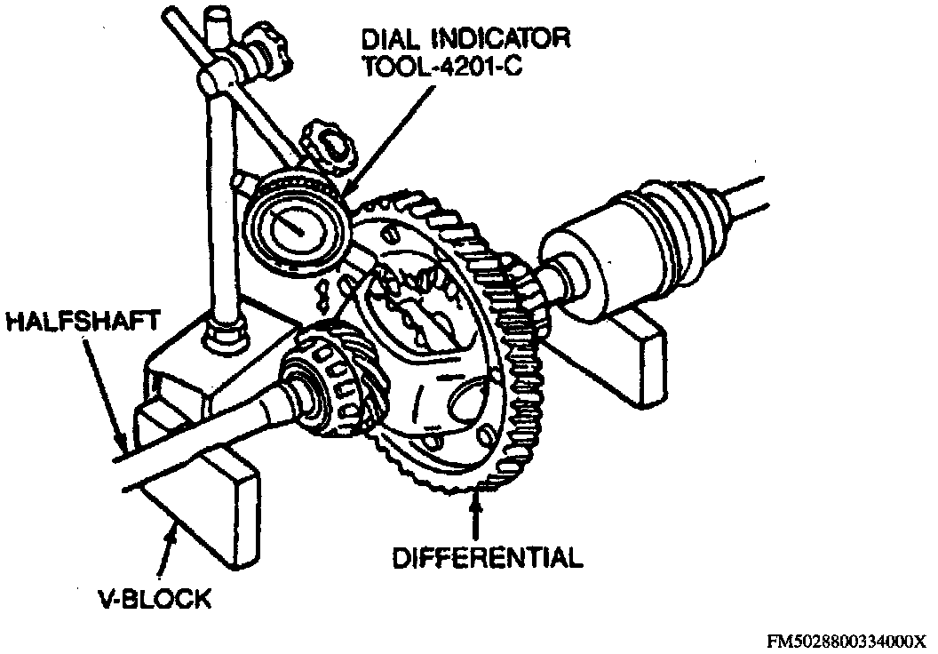 2. Check side gear and pinion gear backlash, using dial indicator 4201-C. Backlash should be 0.004 inch. If backlash is not within specifications, replace differential assembly.