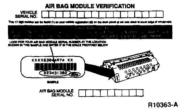 When replacing an air bag module, a prepaid return postcard is provided with the replacement air bag module. The serial number for the new part and Vehicle Identification Number (VIN) must be recorded and sent to Ford Motor Company.