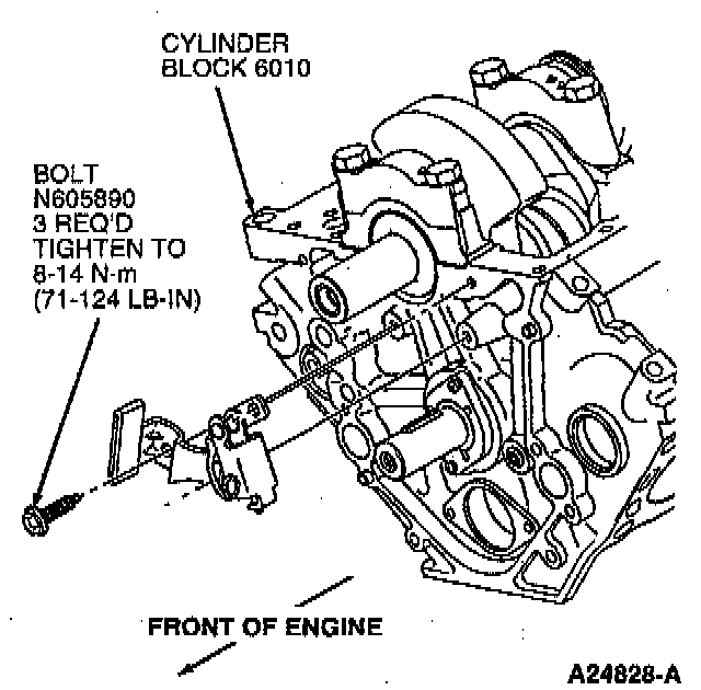 1. With the timing chain vibration damper in the compressed position, install the timing chain vibration damper and retaining bolts to front of cylinder blocks. Tighten retaining bolts to 8-14 Nm (71-123 inch lbs.).