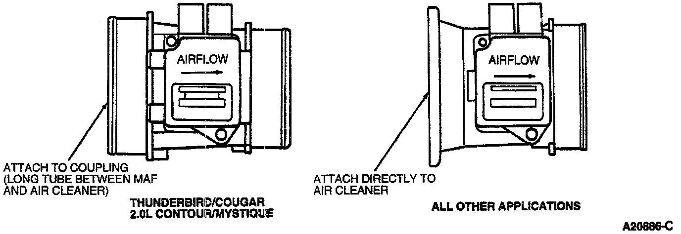 The MAF sensor is located directly in the air flow path between the air cleaner housing and the throttle body. All air entering the intake manifold must pass through the sensor. Located in the MAF sensor directly in the airstream are two platinum wires, a hot wire heated by electrical current and a cold reference wire. The MAF sensor uses the air flow across these wires to calculate its output.