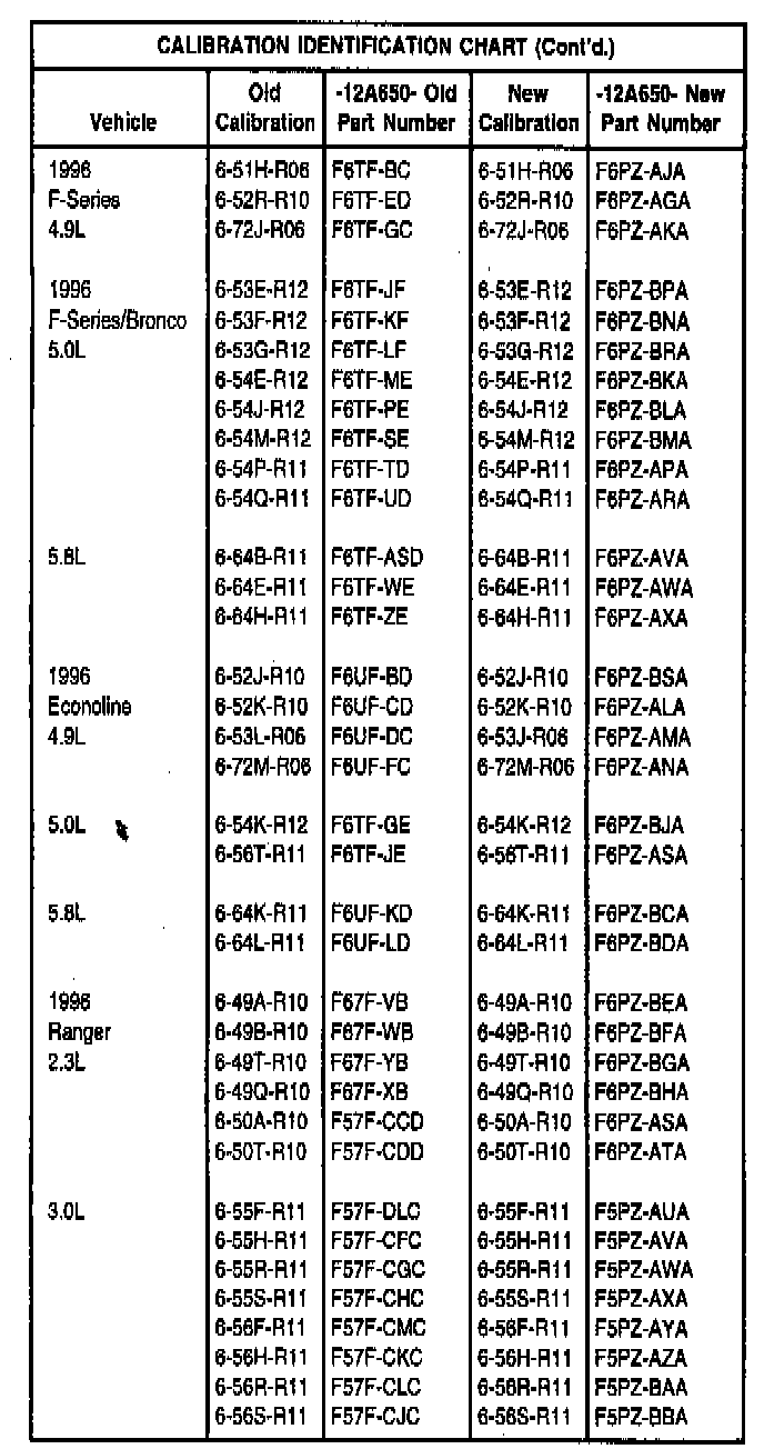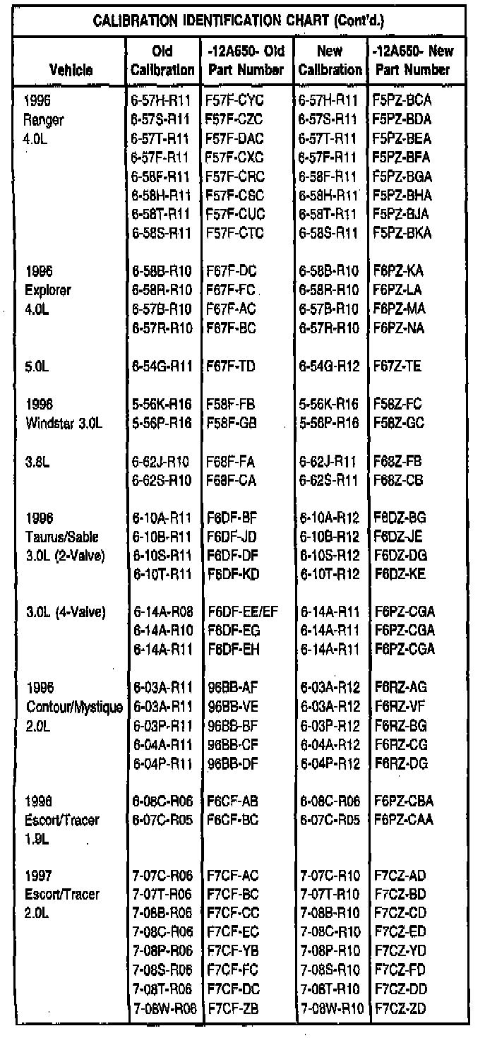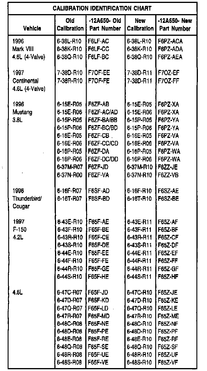 2. Check to verify vehicle does not have the latest calibration. If it does not, reprogram the PCM with the appropriate calibration, referring to the following Calibration Identification Chart using the April 1997 or later CD-ROM.