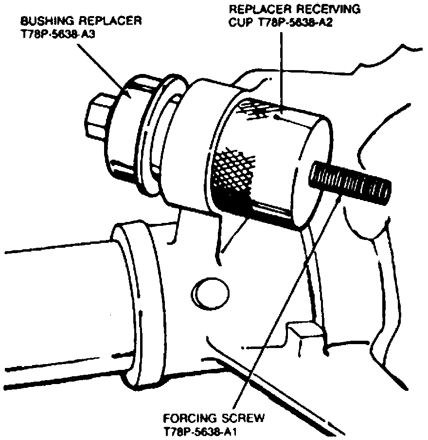 2. Place bushing remover and installer set T78P-5638-A, or equivalent, as shown, and remove bushing.