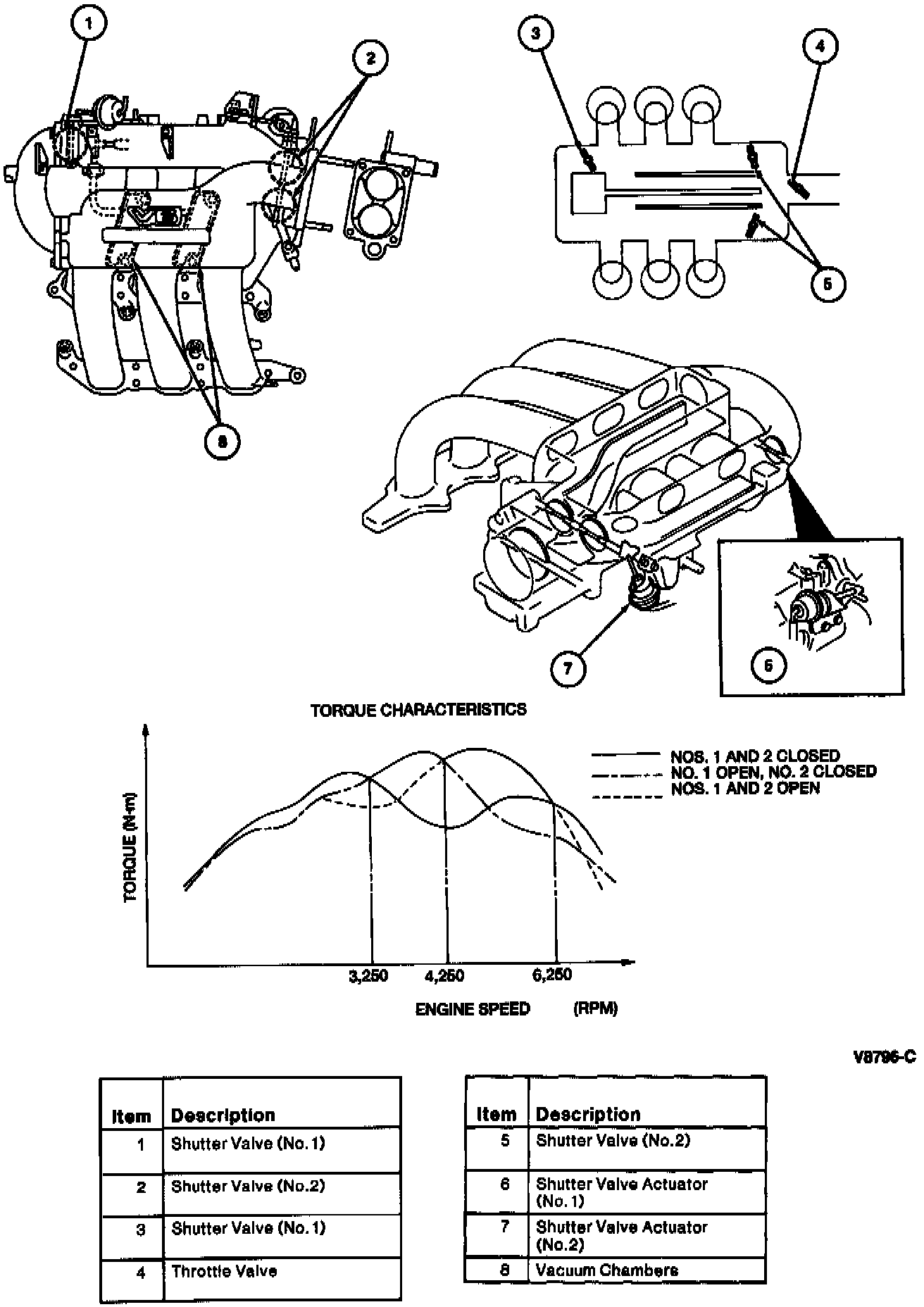 There are two vacuum chambers located under the front (LH) bank of the intake manifold. These vacuum chambers maintain a constant vacuum to the VRIS shutter valves during wide open throttle operation and other low-vacuum, low-speed situations.