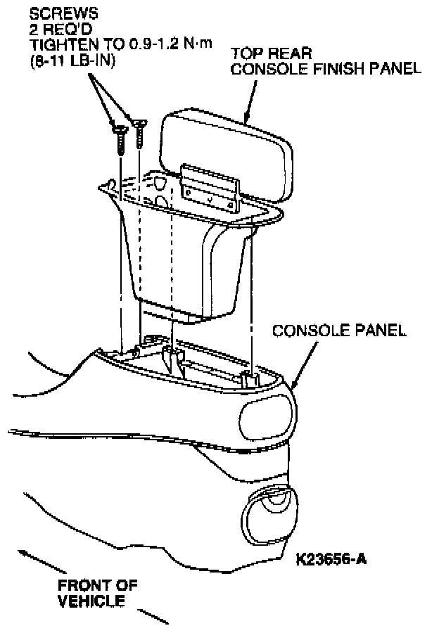 10. To install, reverse removal procedure. lighten two top bolts retaining console panel to front and rear bracket to 9-12 Nm (80-106 lb in). Tighten side mounting bolts to 9-12 Nm (80-106 lb in). Tighten top rear console finish panel retaining screws to 0.9-1.2 Nm (8-11 lb in).