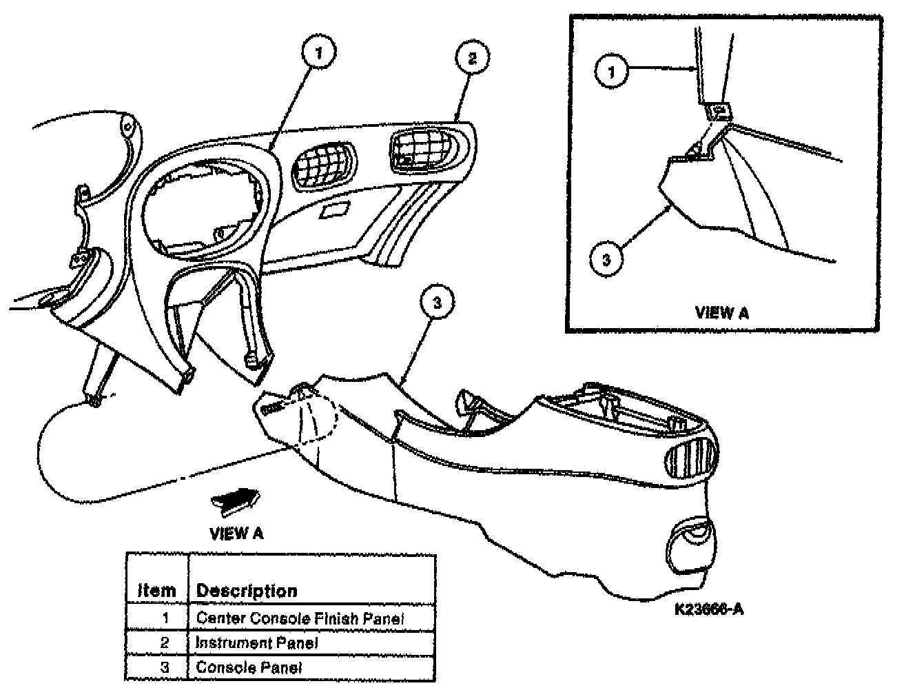 3. Remove two screws retaining console finish panel to console panel and remove console finish panel.