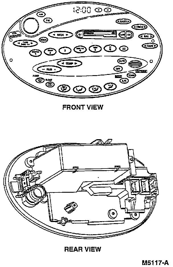 An illumination bulb in the control assembly provides backlighting for the Vacuum Fluorescent Display (VFD) window. When the panel dim control on the headlamp/parking lamp switch is adjusted, the intensity of the light from this bulb will increase or decrease depending upon the adjustment. (The backlighting on the control assembly, as well as in other instrument panel locations, will dim whenever the headlamp switch is in the HEAD position.