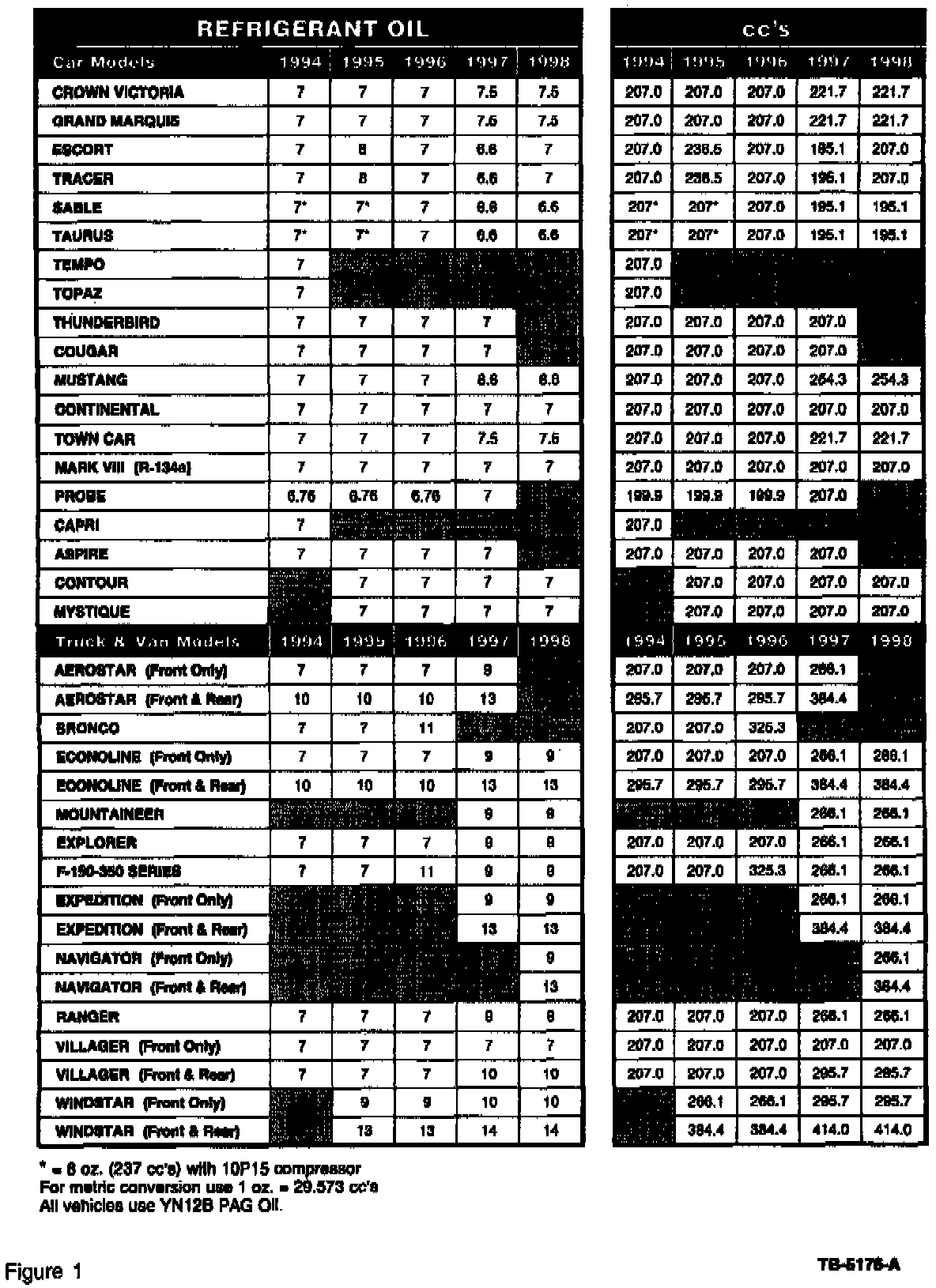 Refer to Figure 1 to determine how much refrigerant oil is needed to service an A/C system.