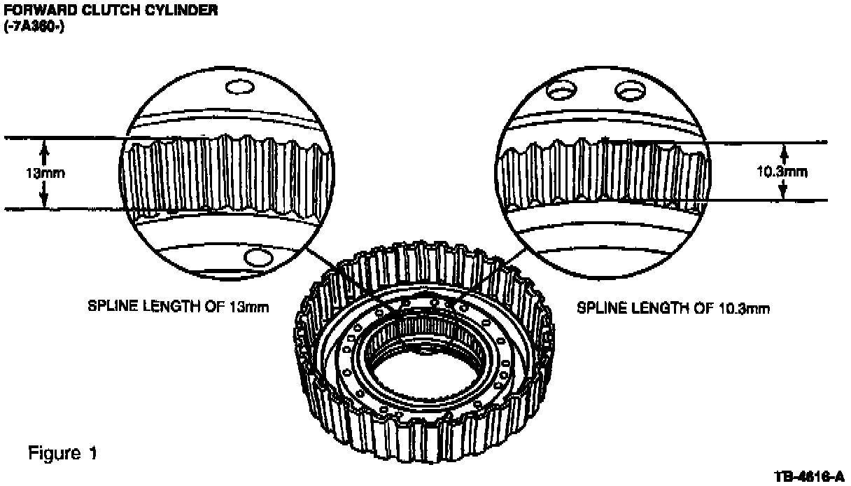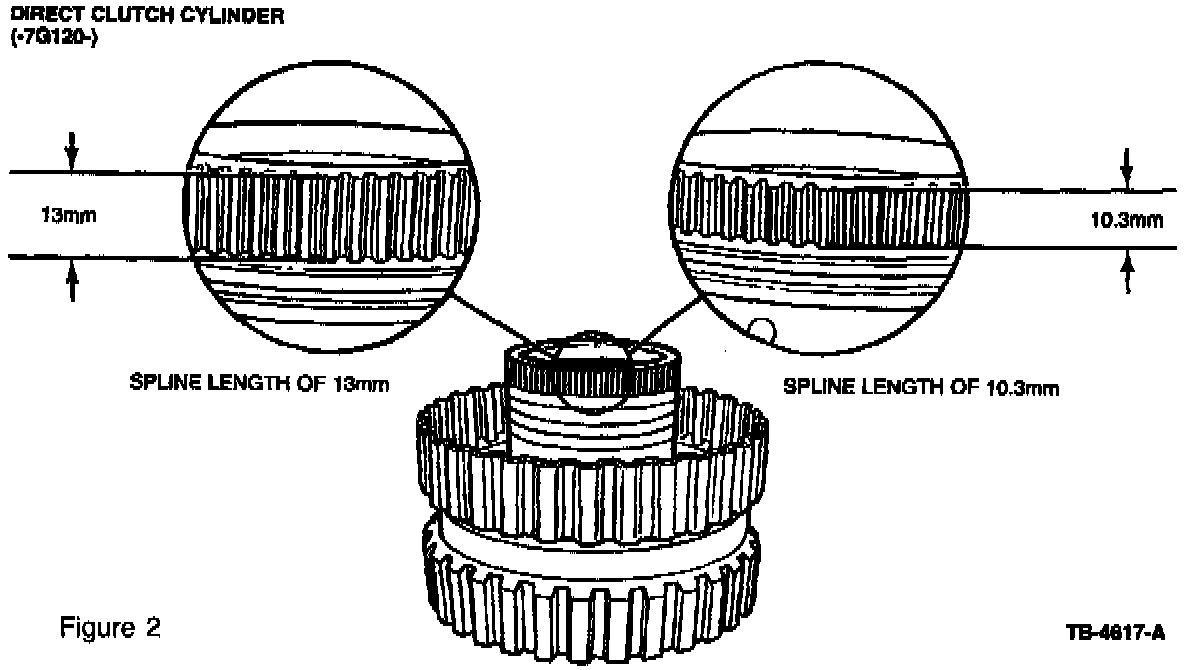 If replacement of hardware is necessary, inspect the spline length of the Forward Clutch Hub (Figure 1) and the Direct/Intermediate Clutch Hub (Figure 2). Refer to the following Parts Application and Spline Length Data to select correct part.