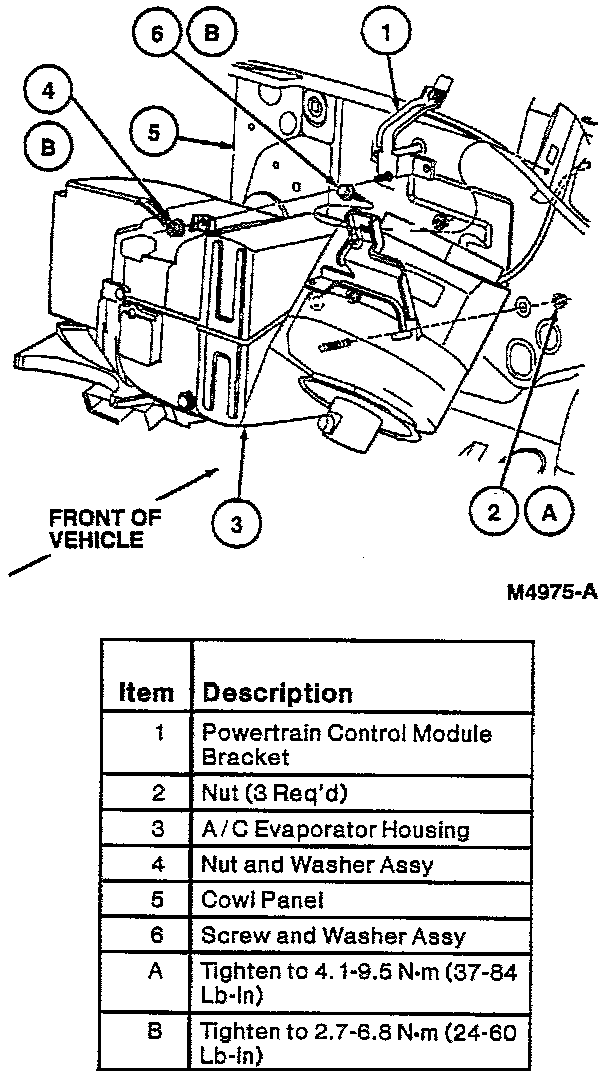 2. Install the three nuts in the engine compartment retaining the A/C evaporator housing to the cowl panel. Tighten to 4.1-9.5 Nm (37-84 in lb).