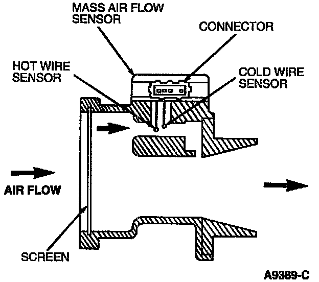 The MAF sensor is located directly in the air flow path between the air cleaner housing and the throttle body. All air entering the intake manifold must pass through the sensor. Located in the MAF sensor directly in the airstream are two platinum wires, a hot wire heated by electrical current and a cold reference wire. The MAF sensor uses the air flow across these wires to calculate its output.