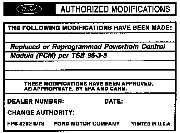 Obtain an Authorized Modifications Decal and list the date, dealer number, and summary of modifications performed. Select a prominent place adjacent to the Vehicle Emission Control Information Decal suitable for installing the Authorized Modifications Decal. Clean the area, install the decal, and cover it with a clear plastic decal shield.
